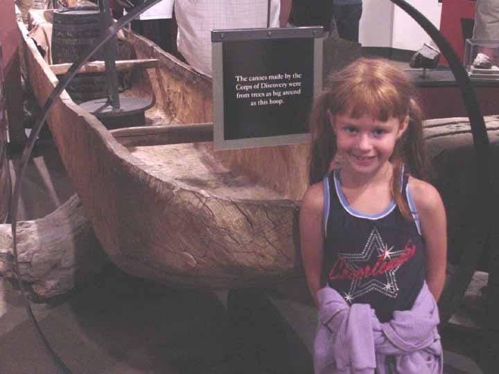 Katelyn with dugout canoe at the Lewis and Clark Interpretive Center at Cape Disappointment.