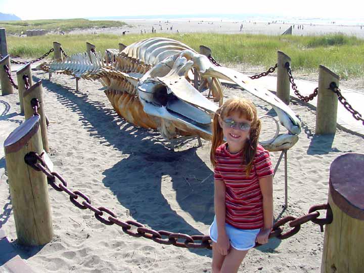 Katelyn with the skeleton of a Gray Whale at Long Beach, Washington.