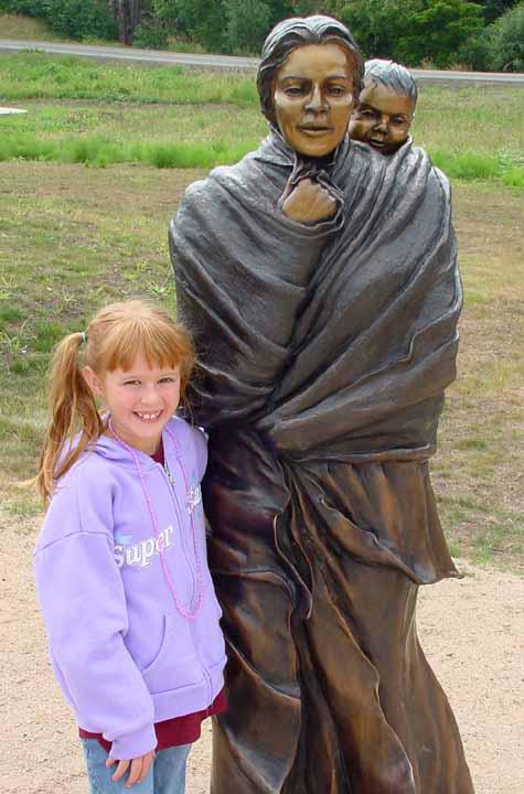 Katelyn standing next to statue of Sacajawea who is carrying her son Jean Baptiste Charborneau.