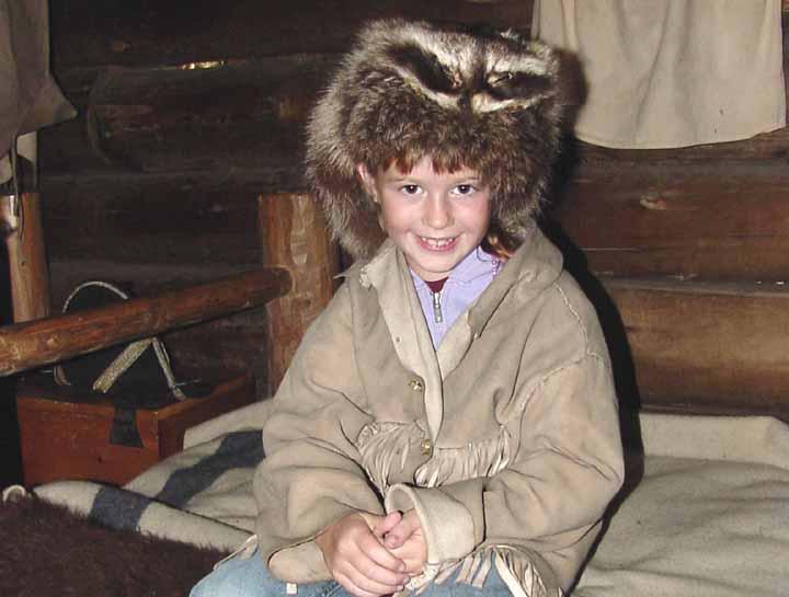 Katelyn at Fort Clatsup wearing buckskin and a coon hat.