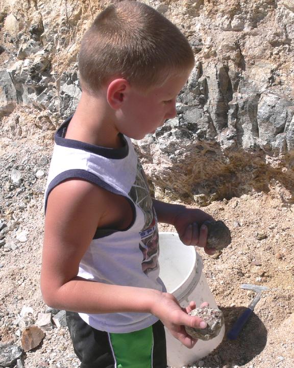 Kyle holding two thunder eggs that he just dug up.