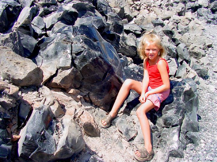 Summer sitting on the sharp, shiny, black obsidian.
