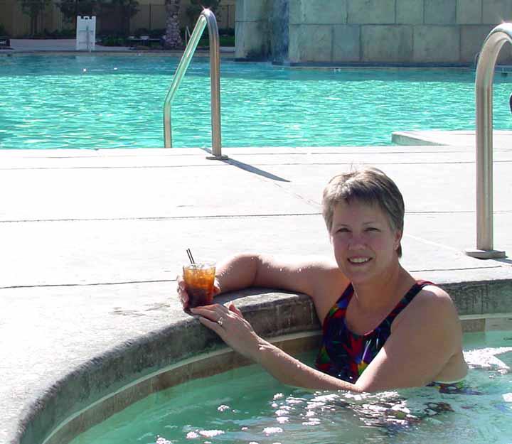 Diana in hot tub, with rum and coke.